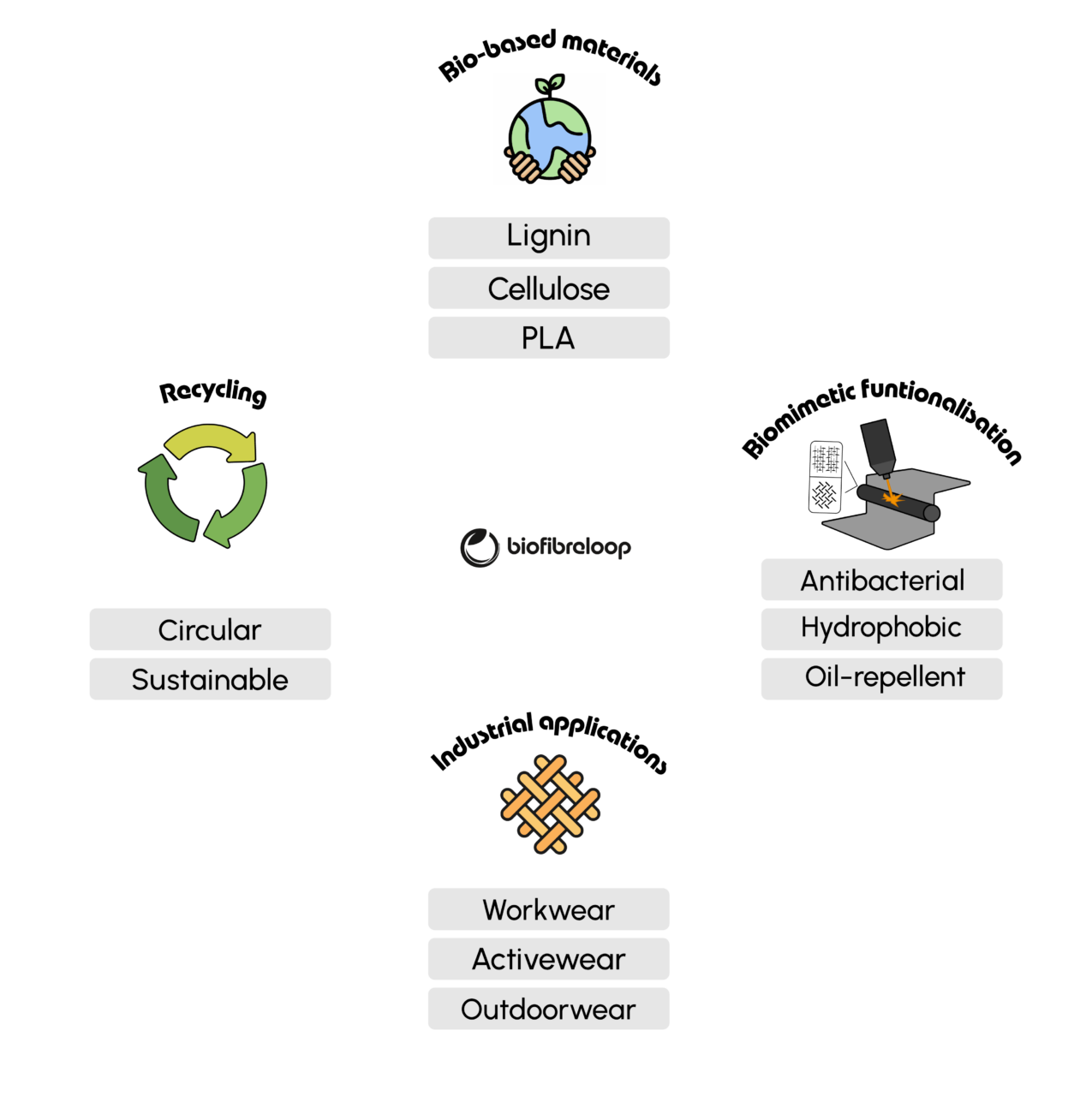 Our concept encompasses four essential aspects: the use of bio-based materials, the development of a biomimetic functionalisation technology, the application of the resulting textiles in industrial settings, and the establishment of recycling routes for the bio-based materials.